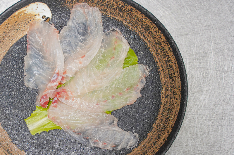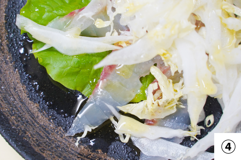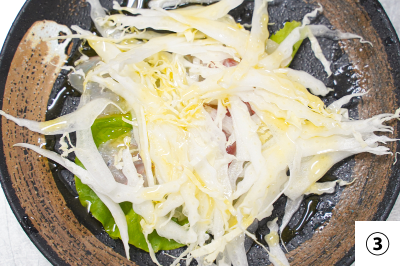 ③グレをお皿に盛り、上から塩をふってスライスした白菜を上に飾る。
